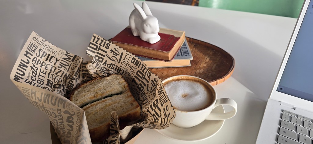 In this moment, I can’t quite believe this is my life. I feel very “writerly” typing away on my trusty Chromebook, a little ceramic rabbit watching over a stack of old books nearby. I’m sipping a cappuccino and preparing to nibble on a breakfast sammy wrapped in words—how fitting. The mist is slowly burning off at the sun’s insistence, and the taps of my keyboard keep time to the soft jazz playing in the background.